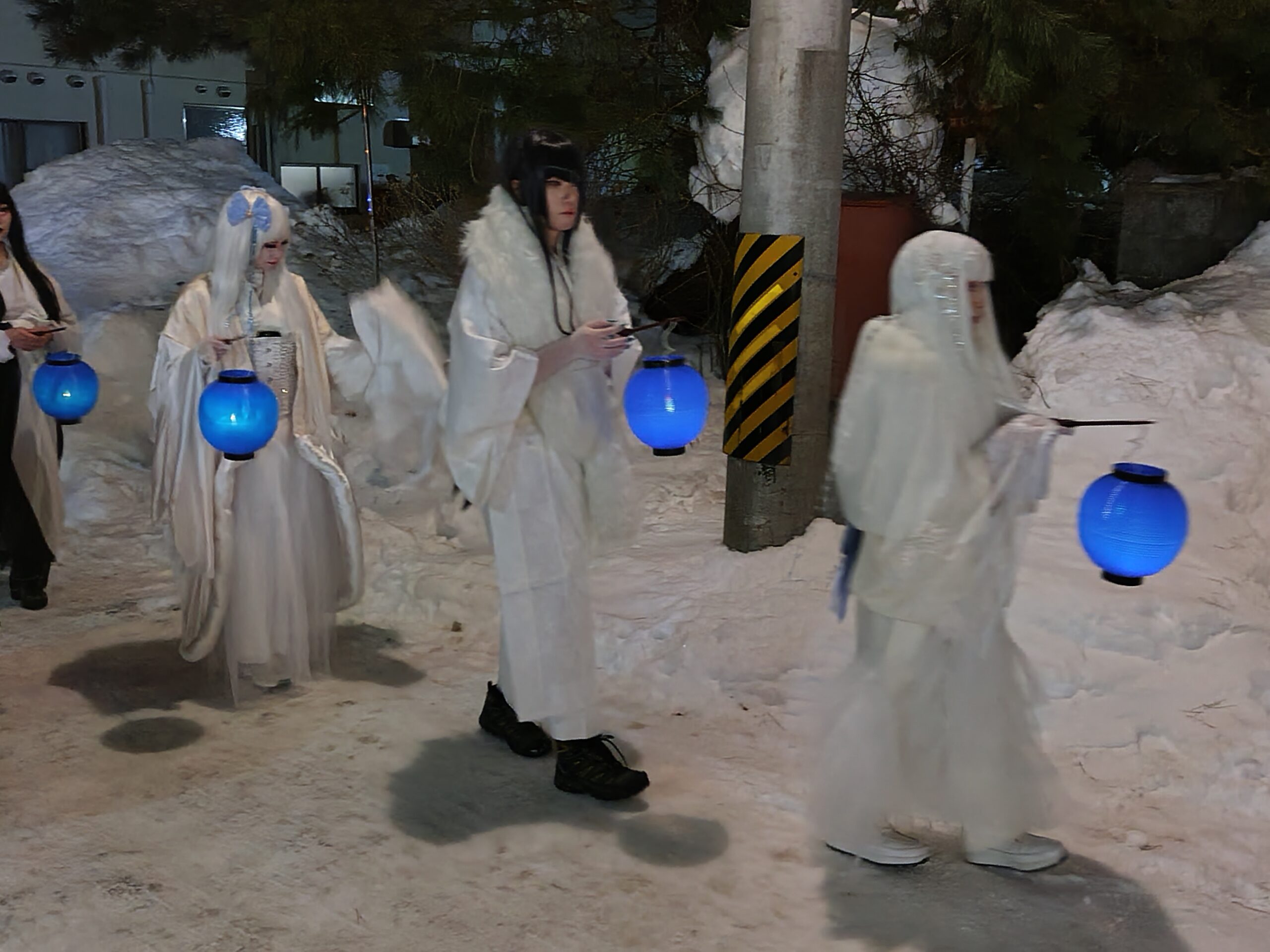 そして、この日はメインがもう一つ。「雪女まつり」というお祭りが行なわれます。夕食後の7時半前から、雪女の行列が始まり、雪乞いなどの行事が行われました。